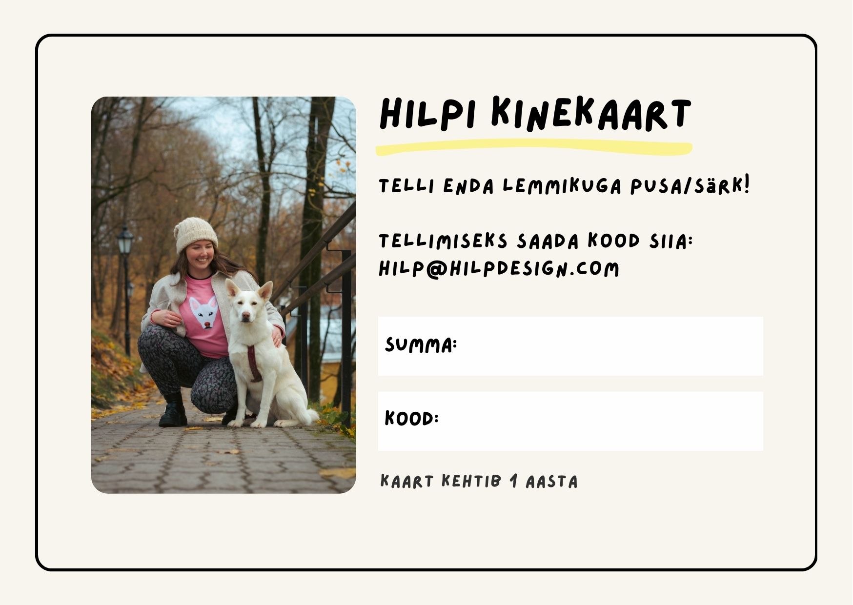 Vali välja kujundus, salvesta see ja prindi välja. Kirjuta kaardile kinkekaardi kood, mis saadeti teile e-postiga peale ostu sooritamist. Soovi korral saada kood ja kaart e-postiga kingisaajale.